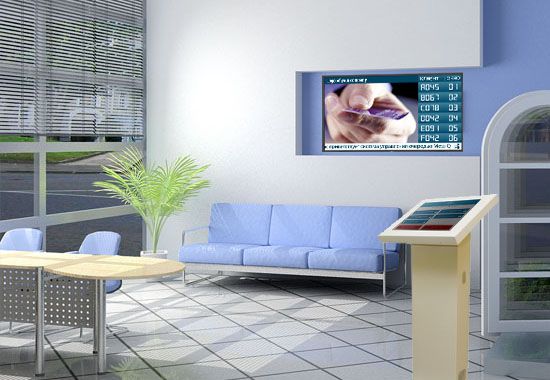 Когда клиент находится в зоне ожидания, в зоне его видимости располагается главное информационное табло электронной очереди в виде LCD-панели, на котором выводятся приглашения подойти к освободившемуся оператору в следующем виде: номер клиента, номер свободного оператора.